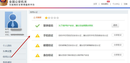 登陸后,在首頁(yè)點(diǎn)擊【個(gè)人中心】進(jìn)入個(gè)人中心,點(diǎn)擊左側(cè)菜單【信用認(rèn)證】