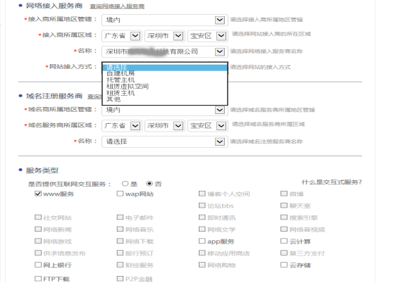 3. 網(wǎng)絡(luò)接入服務(wù)商,域名注冊(cè)服務(wù)商:可以選擇境內(nèi)與境外,在境內(nèi)可以按照地域去進(jìn)行選擇,當(dāng)找不到所使用的服務(wù)商時(shí),選擇其他可以手動(dòng)輸入服務(wù)商名稱(chēng)等信息。